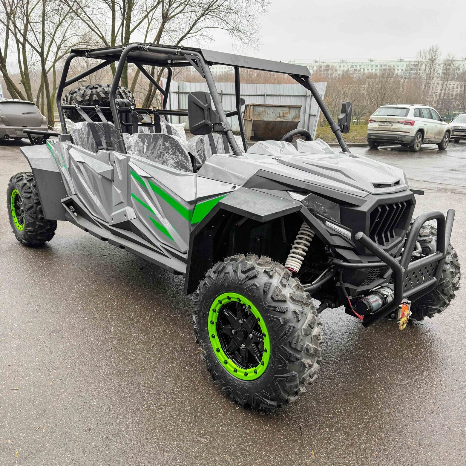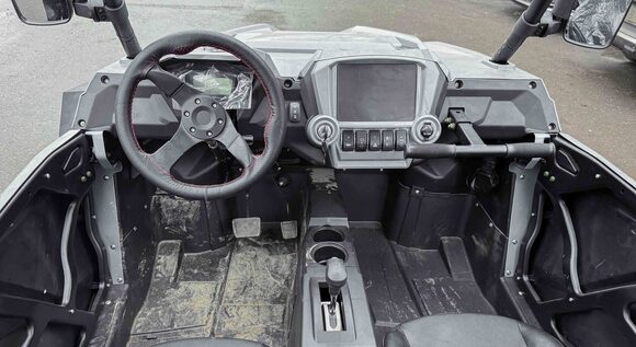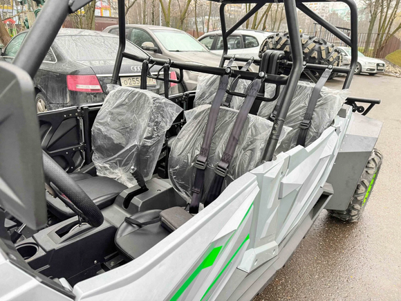 Четырехместный баггиДля тех, кто любит путешествовать компанией по бездорожью, представлен четырехместный багги – мощный, вместительный и готовый к любым испытаниям.Сердце багги – надежный V-образный двухцилиндровый двигатель (799 см³, 59 л.с.) с жидкостным охлаждением, обеспечивающий стабильную работу в самых сложных условиях. Использует АИ-92, что делает эксплуатацию экономичной.Превосходная проходимость – благодаря вариаторной трансмиссии с возможностью переключения между 2WD и 4WD и передним дифференциалом. Независимая подвеска с двойными А-образными рычагами и ходом 110 мм (спереди) / 95 мм (сзади) гарантирует плавный ход по бездорожью. Опционально доступны азотные амортизаторы для повышенной выносливости.26-дюймовые шины (26x10 R14) с легкосплавными дисками и гидравлическими тормозами обеспечивают уверенное движение и контроль в любых условиях. Клиренс 29 см позволяет преодолевать серьезные препятствия, а электрическая лебедка на 1600 кг выручит в сложных ситуациях.Комфорт и управляемость:Электроусилитель руля (EPS) – легкое и точное управление.