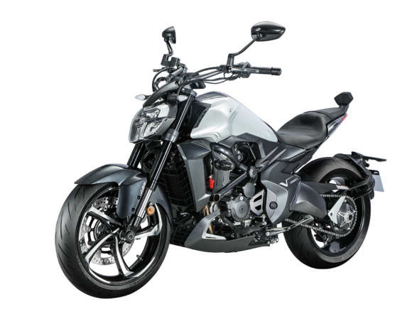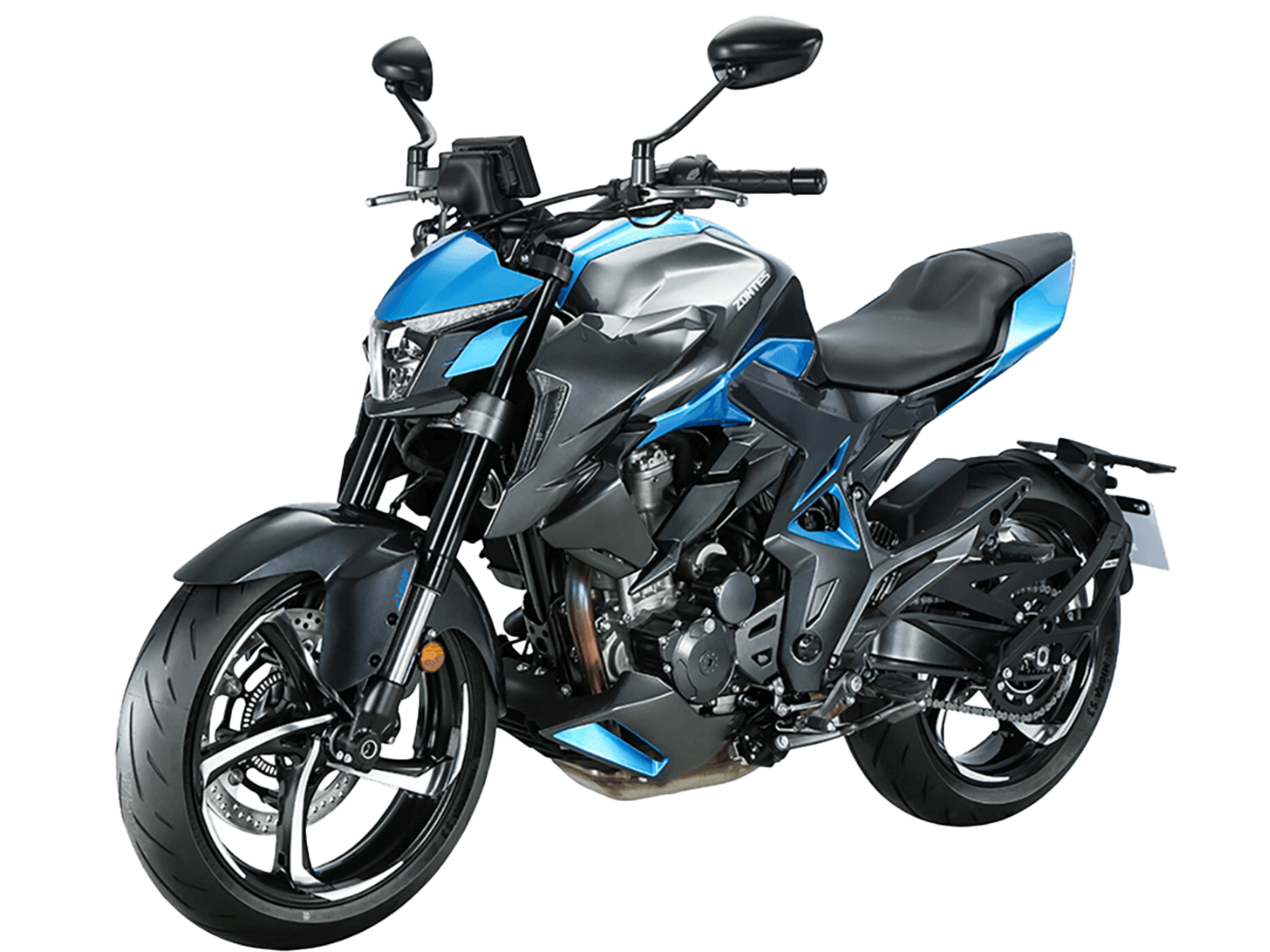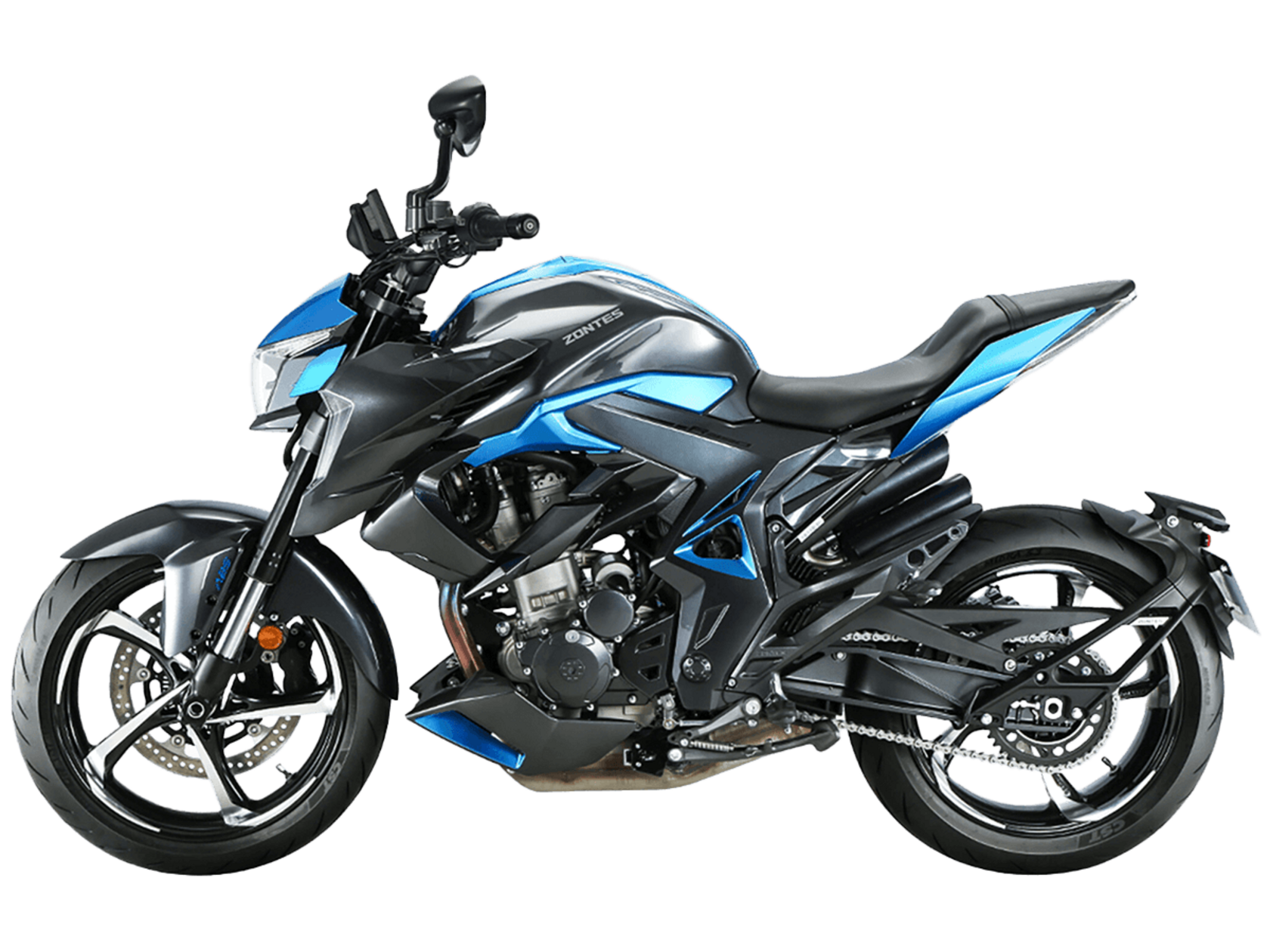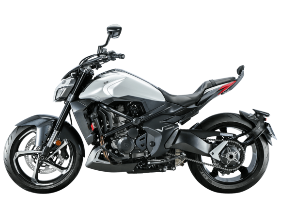 Мотоцикл ZONTES ZT350-R – современный нейкед со стремительным и дерзким дизайном. Хорошо подходит как для поездок в городской среде и маневрирования в межрядье.Силовая установка представлена одноцилиндровым 4-тактным двигателем ZT184MP с 4 клапанами и 2 верхними распредвалами. Двигатель имеет объём 348 см³ и обеспечивает мощность в 39 л.с. Оснащён инжектором BOSCH и системой жидкостного охлаждения. Механическая коробка передач имеет 6 ступеней и схему 1-N-2-3-4-5-6. Запуск двигателя осуществляется с помощью бесключевого доступа.Ёмкость топливного бака 15 литров.Колёса представлены литыми алюминиевыми дисками диаметром 17 дюймов. На мотоцикл установлены датчики давления в шинах, показатели от которых выводятся на приборную панель. Для подвески спереди используется телескопическая вилка, сзади – моноамортизатор. Гидравлические дисковые тормоза произведены испанской компанией J.JUAN, входящей в холдинг BREMBO.Для освещения используется яркая LED-оптика, а приборная панель представлена цифровым дисплеем. Имеется 2 USB-порта.Габариты мотоцикла 2030х795х1120 мм. Колёсная база 1390 мм. Высота по седлу 795 мм. Вес 165 кг.Комплектация и внешний вид мотоцикла могут отличаться в зависимости от поставки. Изображение на сайте не гарантирует наличие тех или иных опций. Уточняйте информацию при оформлении заказа.