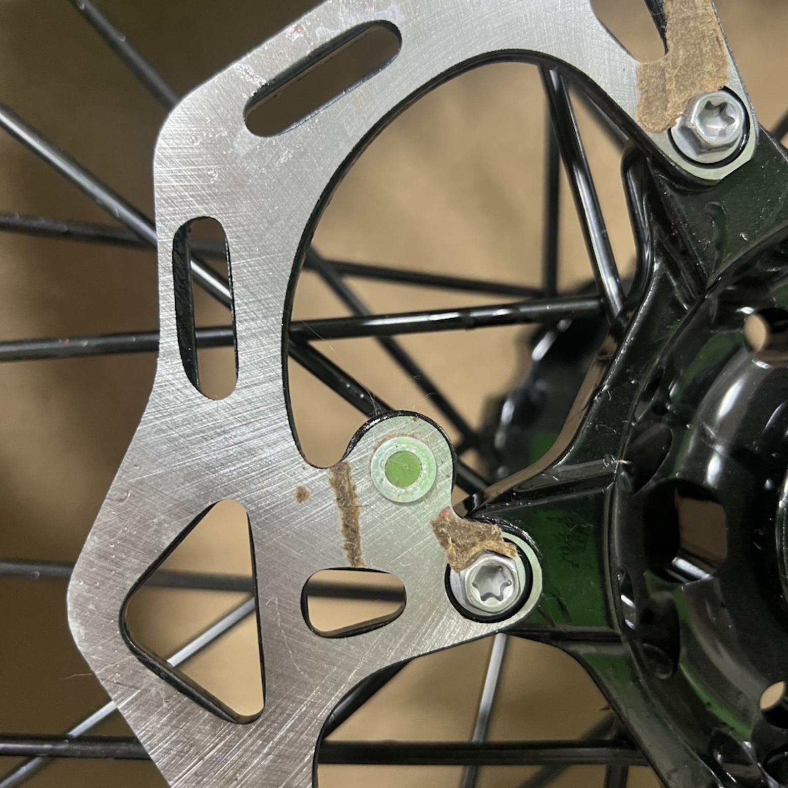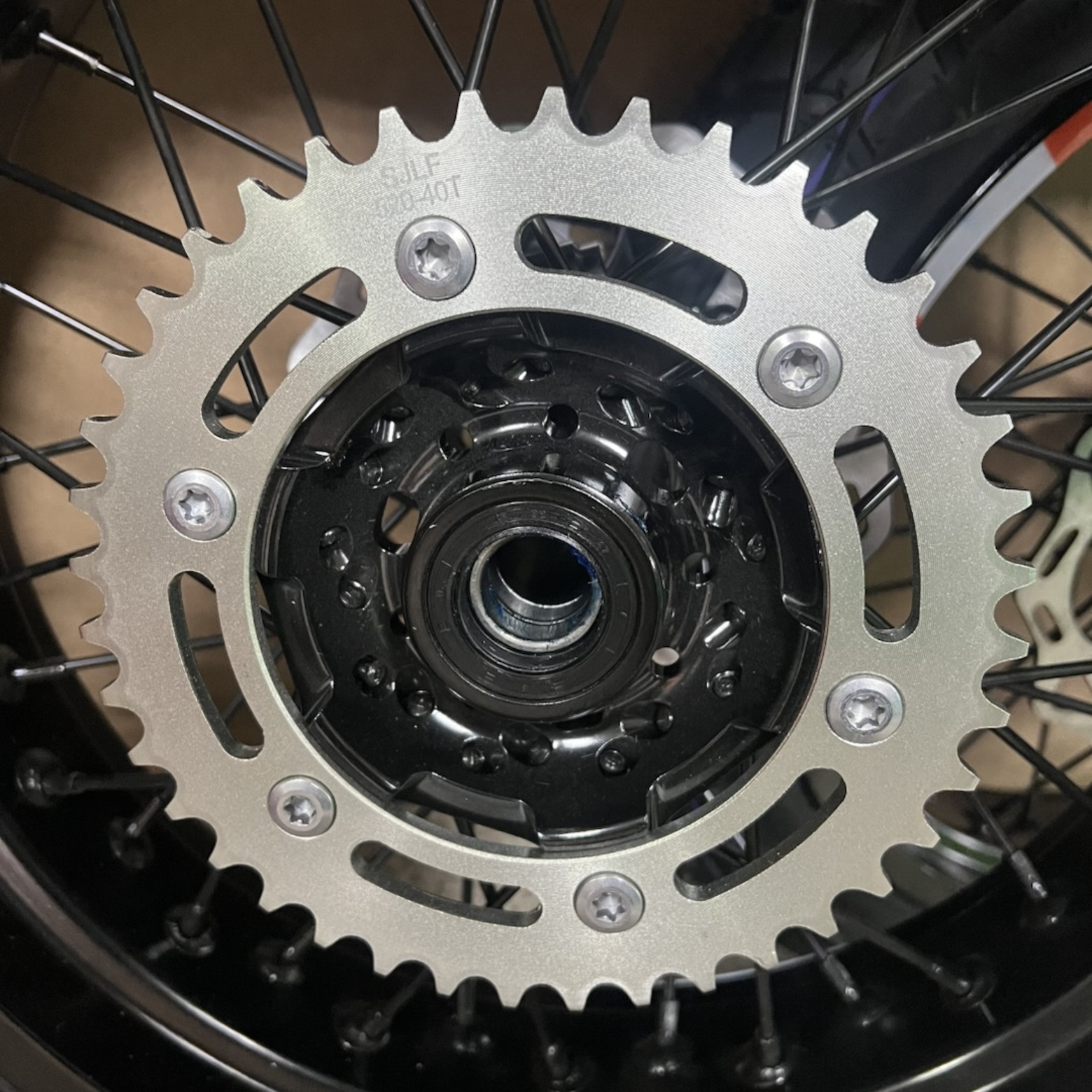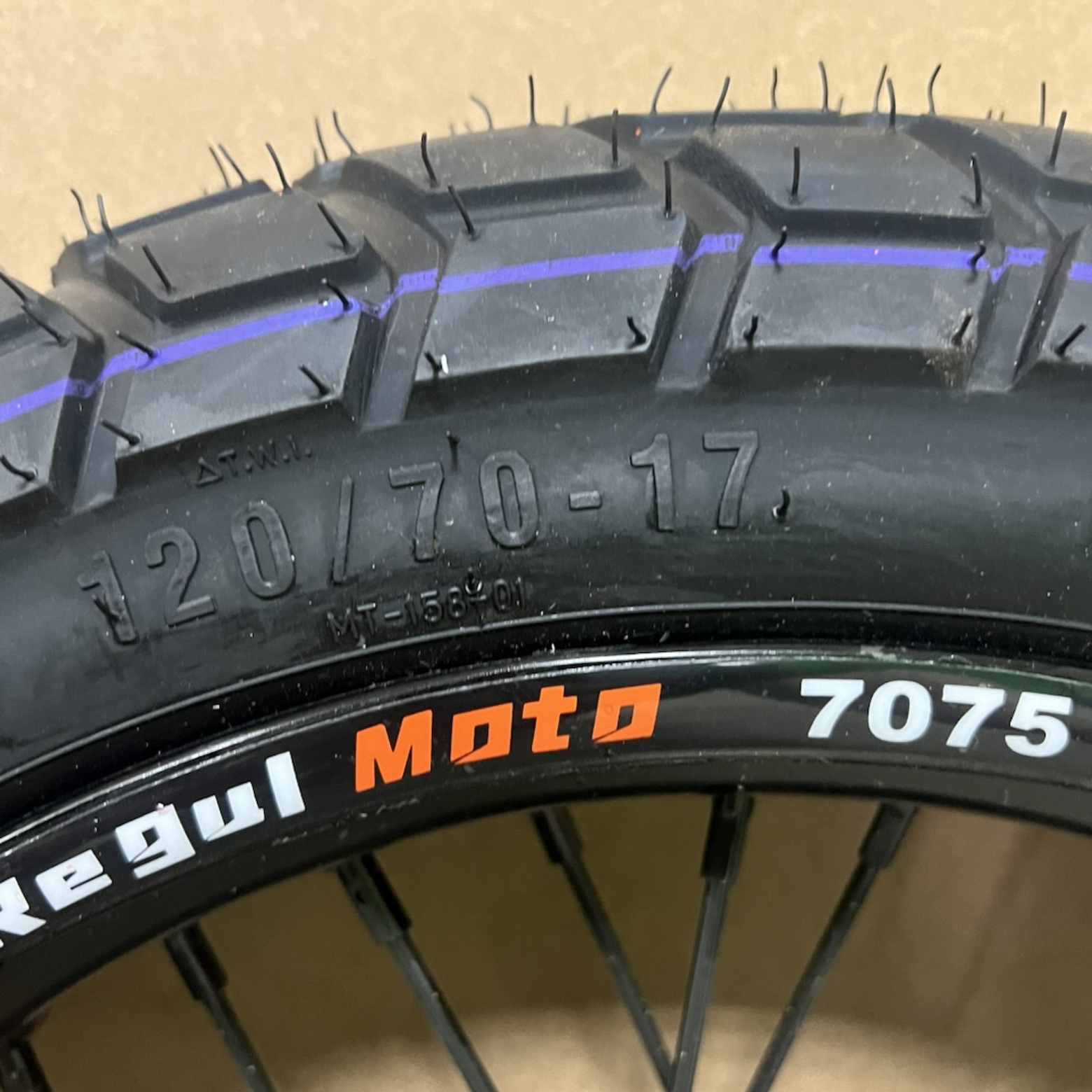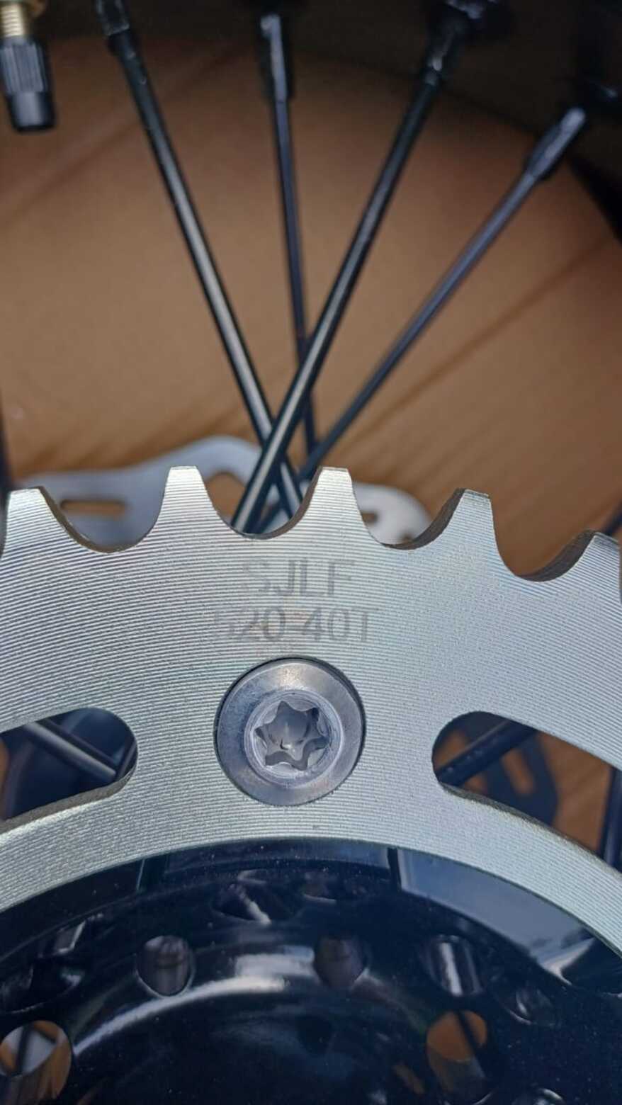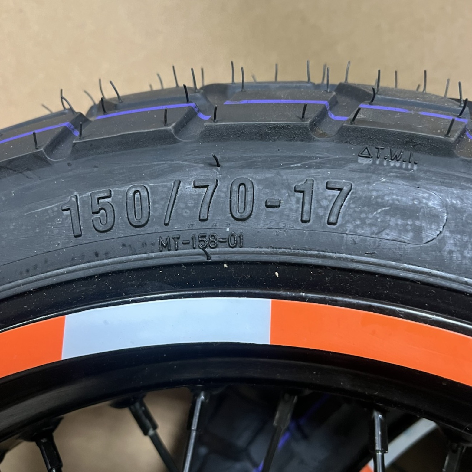 Задний диск с шиной 150/70-17, ось 25 мм, тормозной диск 220 мм, звезда 520-40T, ширина ступицы 167 мм.