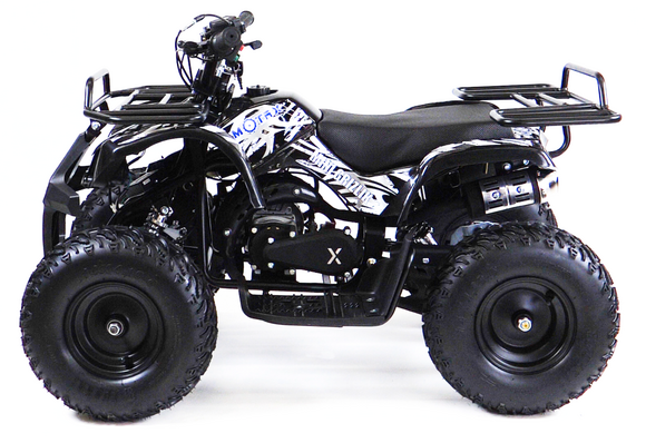 квадроцикл MOTAX GRIZLIK Х16 ES BW(с электростартером и родительским контролем). Отличие от остальных моделей кроется в названии. Этот квадроцикл оборудован 6-дюймовыми колёсами с шинами низкого давления и увеличенного размера, что позволяет получить больший ездовой комфорт и проходимость за счёт увеличенного клиренса.Отлично подойдёт для детей от 3 до 8 лет.Квадроцикл оборудован компактным, двухтактным бензиновым двигателем объёмом 50 куб. см. в паре с фрикционным сцеплением центробежного типа. Это обуславливает простоту и надежность конструкции. Квадроцикл имеет неплохую базовую комплектацию: он оборудован электрическим стартером, пультом дистанционного глушения и запуска двигателя, механическим ограничителем скорости, кнопкой быстрой остановки двигателя, яркими передними светодиодными фарами с режимом ближнего и дальнего света, раздвоенной системой выхлопа, механическим ручным стартером с механизмом легкого запуска. За счёт этого механизма существенно снижено усилие при запуске двигателя, с этой задачей может справиться и ребенок. Простота управления обусловлена фирменной передней подвеской полузависимого типа, которая позволяет сохранить стабильность в движении и лёгкость рулевого управления, что является важным фактором для ребёнка. Передние и задние механические дисковые тормоза способны эффективно остановить лёгкий и прочный квадроцикл. Детский квадроцикл оборудован передним и задним багажниками и прочным передним бампером. Эта модель отлично подойдёт как для получения первого опыта вождения, так и для активной езды по дачным дорожкам и лесопарковым зонам.