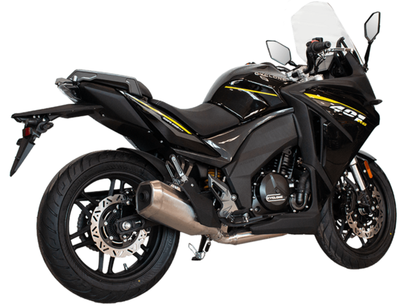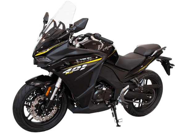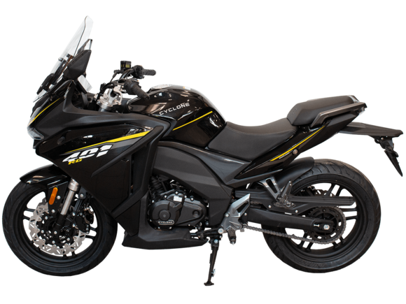 CYCLONE RG401 (SR400GS-B) – турист для покорения самых непростых и протяжённых маршрутов. Он обладает стремительным и современным дизайном в лучших “традициях жанра” туристических мотоциклов.Рядный двухцилиндровый четырёхтактный двигатель объёмом 401 см3 выдаёт 43 л.с. на 9500 об/мин. Максимальный крутящий момент достигается на 8000 об/мин и составляет 37 Н·м. Инжекторный впрыск топлива с блоком управления BOSCH увеличивает топливную экономичность, а также позволяет добиться высокой приёмистости и неприхотливости агрегата. Жидкостная система охлаждения не допустит перегрева двигателя а даже на самых непростых маршрутах. На мотоцикл установлена 6-ступенчатая механическая коробка передач.Максимальная скорость мотоцикла составляет 155 км/ч.RG401 оснащён литыми алюминиевыми дисками диаметром 17 дюймов. Колёса обуты в бескамерные покрышки TIMSUN. С неровностями дороги эффективно справляются телескопическая вилка перевёрнутого типа спереди и маятник с моноамортизатором сзади. Ход передней подвески составляет 120 мм, задней – 55 мм. Оба компонента подвески являются регулируемыми. Эффективное и безопасное замедление с любых скоростей обеспечивают гидравлические дисковые тормоза с двухканальной системой ABS спереди и сзади.Клиренс мотоцикла составляет 155 мм. Объём топливного бака – 21 л. Снаряжённая масса – 213 кг.Модель имеет два видеорегистратора, механическую регулировку ветрового стекла, датчики давления в шинах, подсветку пультов и два USB-порта. При желании можно оснастить мотоцикл двумя боковыми кофрами.Мотоцикл сочетает в себе отличные технические характеристики, комфорт и надёжность, что позволяет вам ощутить настоящую свободу на любой дороге.