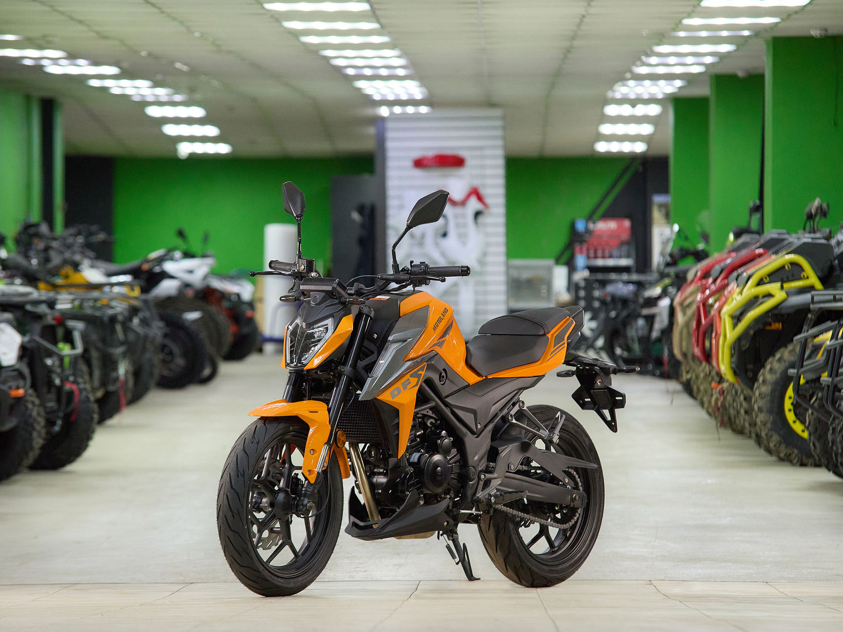 Новинка 2023 года MOTOLAND 250 DF BIG BORE !!!Представляем Вашему вниманию дорожный мотоцикл на шестискоростном двигателе 174 MN (CBS300 с балансиром) , с большим радиатором водяного охлаждения, с электростартером, мощностью 24 л.с. На двигателе установлен карбюратор Keihin PE 34 MV.Также на новинке передние и задние тормоза оснащены 4-х поршневыми суппортами, увеличен R переднего тормозного диска, литые алюминиевые обода , передняя вилка перевёрнутого типа с большим ходом, которая обеспечивает отличную управляемось для комфортного передвижения.Современный дизайн мотоцикла разработан с учетом всех последних новшеств.520Н усиленная сальниковая цепь в сочетании с хорошо подобранными звездами, обеспечивает отличную динамику.Хорошо подобранные покрышки на 17" ободах, 110/70 и140/70, обеспечивают отличное сцепление с дорожным покрытием.Рама скелетная. Удобное двухэтажное кожаное сиденье и обновленная жидкокристаллическая панель приборов с подсветкой - заставят радоваться комфорту и удобству.Передние и задние суппорта 4-х поршневые. Глушитель прямоточный Akrapovic с увеличенным диаметром трубы. Руль двойной усиленный переходного сечения.Передние удлиненные габаритные огни выполнены вертикально и встроены в пластик.Световое оборудование на экономичных и долговечных светодиодах. Топливный бак 12 л. Цвет оранжевый.