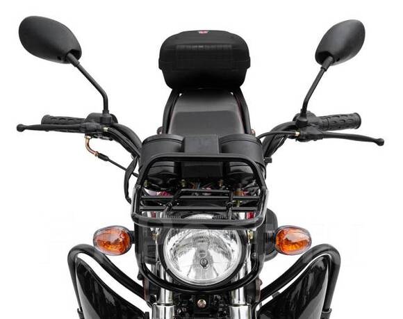 Комплектация Мотоцикл комплектуется всем необходимым оборудованием для комфортной и безопасной эксплуатации на городских и проселочных дорогах: приборная панель, зеркала, световое оборудование, электростартер (двигатель также можно завести при помощи кик-стартера), защитный кожух цепи, складные подножки пассажира и крепкий багажник. Тормоза барабанные.