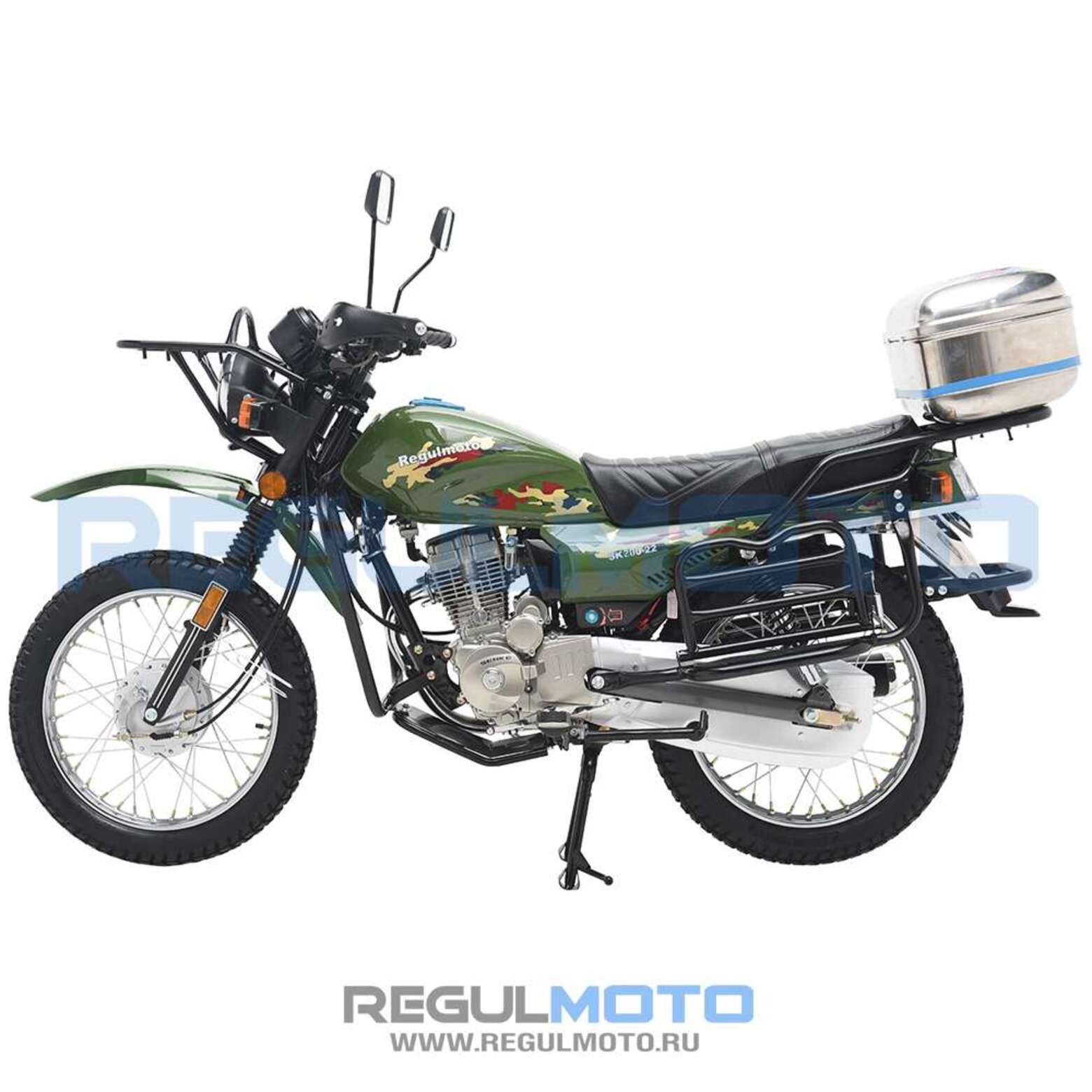 Regulmoto SK200-22 – достойный представитель класса классических дорожных мотоциклов. Эта модель может быть использована в качестве надежного и экономичного средства передвижения по дорогам общего пользования и легкому бездорожью для решения широкого круга эксплуатационных задач.Данный мотоцикл разработан специалистами известной мотоциклетной компании SENKE и собирается на ее производственных мощностях. Благодаря высоким стандартам контроля качества продукция компании пользуется заслуженным признанием экспертов мотоиндустрии и поклонников двухколесного транспорта во многих странах мира.В раме Regulmoto SK200-22 устанавливается проверенный временем 4-тактный одноцилиндровый 200-«кубовый» двигатель с 5-ступенчатой коробкой передач и электростартером, работающий в паре с карбюратором. Средний расход топлива составляет меньше трех литров на сто километров пути. Подвеска представлена телескопической вилкой спереди и двумя амортизаторами сзади. Тормозная система мотоцикла базируется на классических барабанных тормозах в ступицах 18-дюйомвых колес.Мотоцикл в стоковой комплектации оснащается дугами безопасности, кожухом защиты цепи, защитой рук, защитой двигателя, центральной и боковой подножками. Откидные площадки под боковые кофры, передний и задний багажник с установленным на нем кофром позволят перевозить массу полезного груза – заявленная производителем грузоподъемность составляет 180 кг. Благодаря значительному клиренсу, высокому расположению крыльев, комплектации кофром и багажниками мотоцикл Regulmoto SK200-22 способен стать оптимальным выбором для поездок в лес, на рыбалку или охоту.