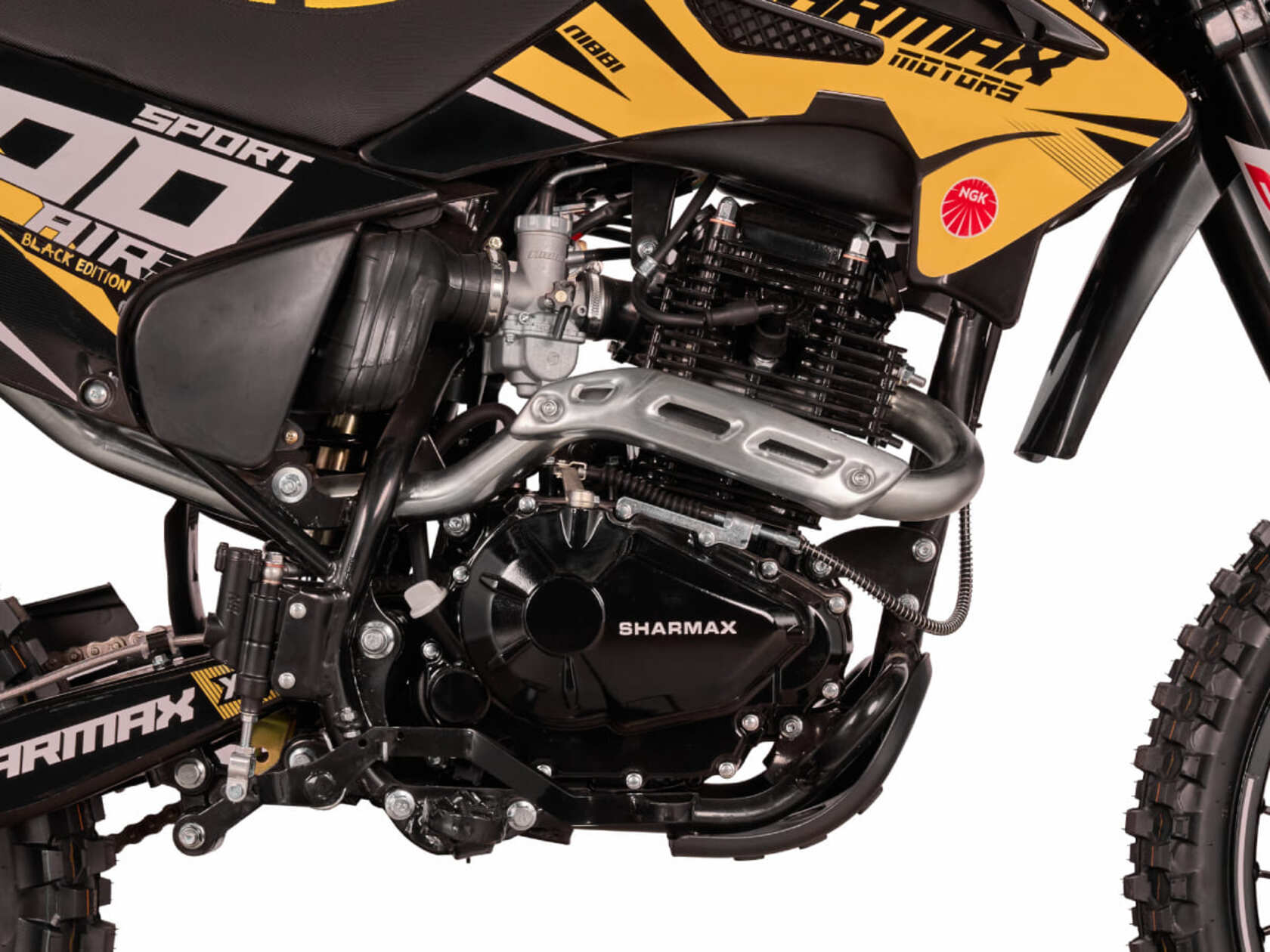 Sharmax Sport 300 Air Black Edition — лимитированная линейка эндуро байков Sharmax, созданная для ценителей сдержанного и стильного дизайна. Отзывчивый и быстрый, мотоцикл Sport 300 Air подарит ощущение превосходства на любой трассе. Премиальное качество и проверенные технологии легли в основу этой новинки 2024 года. Надёжная подвеска, новый двигатель с балансировочным валом усовершенствованная тормозная система — всё это поможет вам выйти на новый уровень в мире эндуро.Идеально сбалансированный мотор 175 FMM-6 от концерна Zongshen, будто был создан для этого байка. 300 куб. см и 25 л.с. — более чем достаточно для быстрого старта. Этот силовой аппарат сделан, чтобы показать оптимальное сочетание полезной мощности и низкого веса.Надёжный карбюратор Nibbi PE 28 — один из лучших в своём классе. Карбюратор от легендарного американского бренда, установленный на десятках эндуро байков во всём мире. Топливная смесь высшего качества наполнит цилиндры за долю секунды и обеспечит быстрый старт даже в лютый холод.6-ступенчатая коробка передач с шестернями из прочного кованного металла практически не изнашивается с течением времени. Лапка переключения — алюминиевая и складная, не пострадает даже в случае жёсткого приземления. Не рекомендуем проверять её на прочность, просто поверьте нам на слово.В конструкции задней подвески расположена прогрессия, позволяющая с комфортом передвигаться по мелкой щебёнке и преодолевать прыжки без ущерба для амортизатора. Байк легко настроить под свой вес и стиль езды, подобрав идеальный баланс жёсткости.Sharmax Sport 300 Air оборудован системой воздушного охлаждения. Нет громоздкого радиатора, вес байка стал меньше, управляемость — лучше. Просто нажмите на газ — и вперёд! За температуру не переживайте — не перегреетесь. Симметричная дуплексная рама, позаимствованная у профессиональных гоночных байков, обеспечит оптимальную жёсткость и отзывчивость. Отдельно проваренные швы дают дополнительную прочность конструкции мотоцикла. Благодаря такой форме райдер и байк становятся одним целым, с лёгкостью преодолевая любые препятствия трека.Двигатель питает мощный литий-ионный аккумулятор ёмкостью 6,5 А/ч. Не подведёт и не разрядится в самый важный момент, обеспечит быстрый старт мотора. Все провода для удобства спрятаны под сиденье, так что за цепляться ветки и вылетать на ходу точно не будут.Шины Cordial буквально вгрызаются в грунт, на оставляя шансов соперникам на виражах. Агрессивный рисунок шашки и мощный грунтозацеп обеспечивают идеальный баланс жёсткости и управляемости.