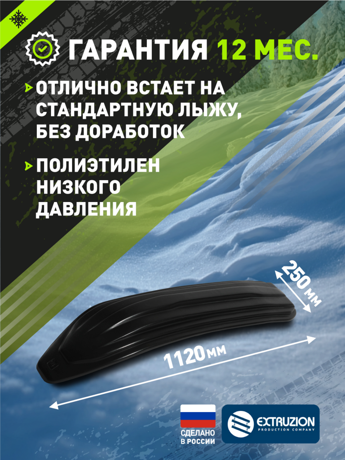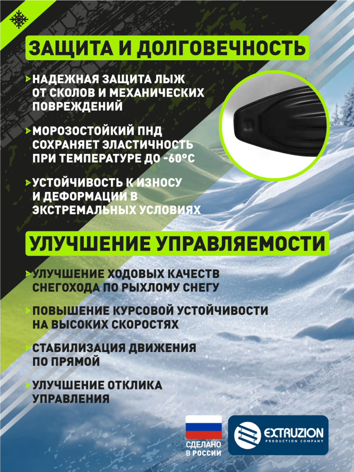 Надежная защита и долговечность. Защищает оригинальные лыжи от сколов, царапин и абразивного износа Изготовлена из морозостойкого ПНД, сохраняющего гибкость при температуре до -60C Принимает на себя основную нагрузку, значительно продлевая срок службы штатных лыж
