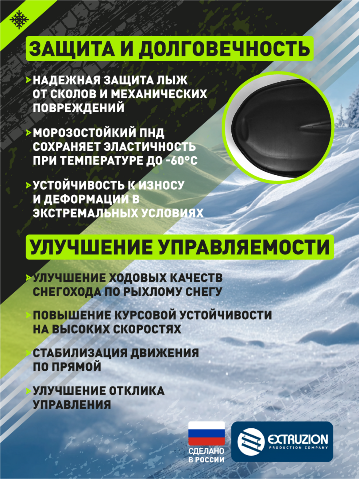 Надежная защита и долговечность. Защищает оригинальные лыжи от сколов, царапин и абразивного износа Изготовлена из морозостойкого ПНД, сохраняющего гибкость при -60C Принимает на себя основную нагрузку, продлевая срок службы лыж