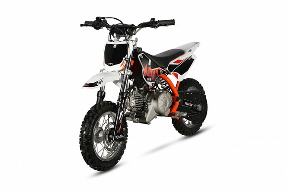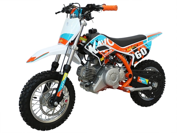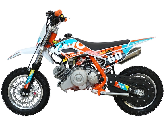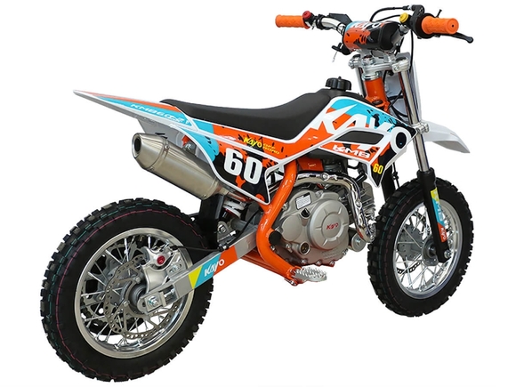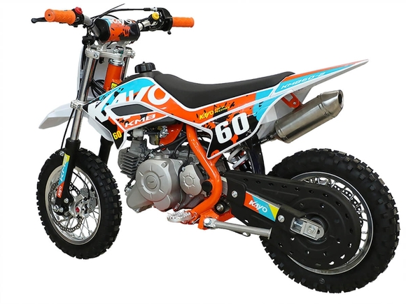 Питбайк KAYO Mini KMB 10/10 – идеальный снаряд для юных экстремалов, который можно использовать на лёгких кроссовых трассах и дорогах с различным покрытием. Удобный, простой и надёжный мотоцикл, который полностью оправдывает свою цену.Одноцилиндровый 4-тактный двигатель воздушного охлаждения ZONGSHEN YX1P44FMC объёмом 57 см3, выдаёт 2,7 л.с. Карбюратор JINGKE PZ14-2 обеспечивает бесперебойную работу техники в самых жёстких условиях эксплуатации, простоту и лёгкость в обслуживании, а также неприхотливость к качеству топлива. Питбайк оснащён автоматической коробкой передач, что позволит райдерам полностью сосредоточиться на управлении питбайком.Аппарат имеет вес всего 42 кг и достаточно большой клиренс – 160 мм. Усиленная рама из хром-молибденового сплава и подвеска позволяют эффективно амортизировать удары при езде по неровностям и препятствиям на трассе. Передняя подвеска – телескопическая вилка длиной 540 мм, задняя – моноамортизатор 245 мм. Рама и пластик являются собственной разработкой производителя. Мотоцикл оснащён классическими алюминиевыми спицованными колёсами диаметром 10 дюймов. Эффективное и безопасное замедление с любых скоростей обеспечивают гидравлические дисковые тормоза.Высококачественная износостойкая резина с развитым протектором отлично держит дорогу на различных типах покрытия. Байк оснащён системой запуска двигателя при помощи кнопки электростартера. Весь цепной привод защищён пластиковым кожухом для безопасности маленького райдера.Если вы ищете послушный, компактный, шустрый, красивый питбайк для своего малыша, считайте, что вы его нашли.