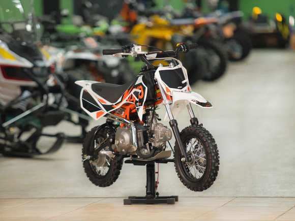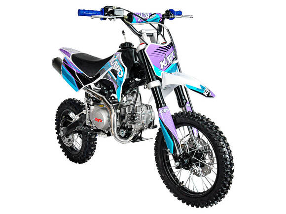 Питбайк KAYO Mini TD125 14/12 – подходящий вариант для смелых ребят от 8 лет. С ним можно научиться основам и контролю скорости на крутых спусках или сыпучих грунтах. Можно использовать и на лёгких кроссовых трассах, и на более сложных рельефах.Одноцилиндровый 4-тактный двигатель воздушного охлаждения ZONGSHEN ZS154FMI объёмом 124 см3, выдаёт 9 л.с. Карбюратор NIBBI PE19 обеспечивает бесперебойную работу техники в самых жёстких условиях эксплуатации, простоту и лёгкость в обслуживании, а также неприхотливость к качеству топлива. Питбайк оснащён полуавтоматической 4-ступенчатой коробкой передач с формулой “N-1-2-3-4”. Сцепление тут выжимать не нужно – переключение происходит под сброс газа, что позволит начинающим райдерам меньше отвлекаться и больше сосредоточиться на управлении питбайком.Аппарат имеет вес всего 65 кг и большой клиренс – 265 мм. Усиленная рама из хром-молибденового сплава и подвеска позволяют эффективно амортизировать удары при езде по неровностям и препятствиям на трассе. Передняя подвеска — телескопическая вилка перевёрнутого типа длиной 660 мм, задняя — моноамортизатор длиной 310 мм. Рама и пластик являются собственной разработкой производителя. Мотоцикл оснащён классическими стальными спицованными колёсами диаметром 14 дюймов спереди и 12 дюймов сзади. Эффективное и безопасное замедление с любых скоростей обеспечивают гидравлические дисковые тормоза марки HSK.Высококачественная износостойкая резина с развитым протектором отлично держит дорогу на различных типах покрытия. Байк оснащён системой запуска двигателя при помощи кнопки электростартера или при помощи рычага кик-стартера. Питбайк имеет вместительный топливный бак на 5,5 л, что гораздо больше, нежели у других байков этого класса.Если вы ищете послушный, компактный, шустрый, красивый питбайк для своего малыша, считайте, что вы его нашли. Это один из лучших мотоциклов для обучения и первых шагов в эндуро и мотокроссе. Он отлично подойдёт как для гонок на трассе, так и для покатушек по пересечённой местности.