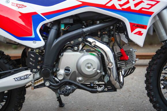 Питбайк серии Apollo Junior подойдет детям и подросткам, новичкам и опытным райдерам в возрасте от 8-ми до 16 лет. Транспорт имеет небольшие размеры, отличается отличной маневренностью, легкостью, высоким скоростным режимом. Модель оснащена одноцилиндровым 4-х тактным двигателем типа YX, карбюратором Jinke PZ19, полуавтоматической коробкой передач, быстросъемным сиденьем, стальным рулем 22 мм, амортизатором VOLT Suspension V1 280 мм, колесами 14/12. Мини-мотоцикл пригоден для активных поездок по лесным дорогам, полям, пересеченной местности. Допустимая нагрузка 100 кг.У нас Вы можете купить этот питбайк с бесплатной доставкой по РФ и гарантией до года. Также его можно приобрести в рассрочку или в кредит.