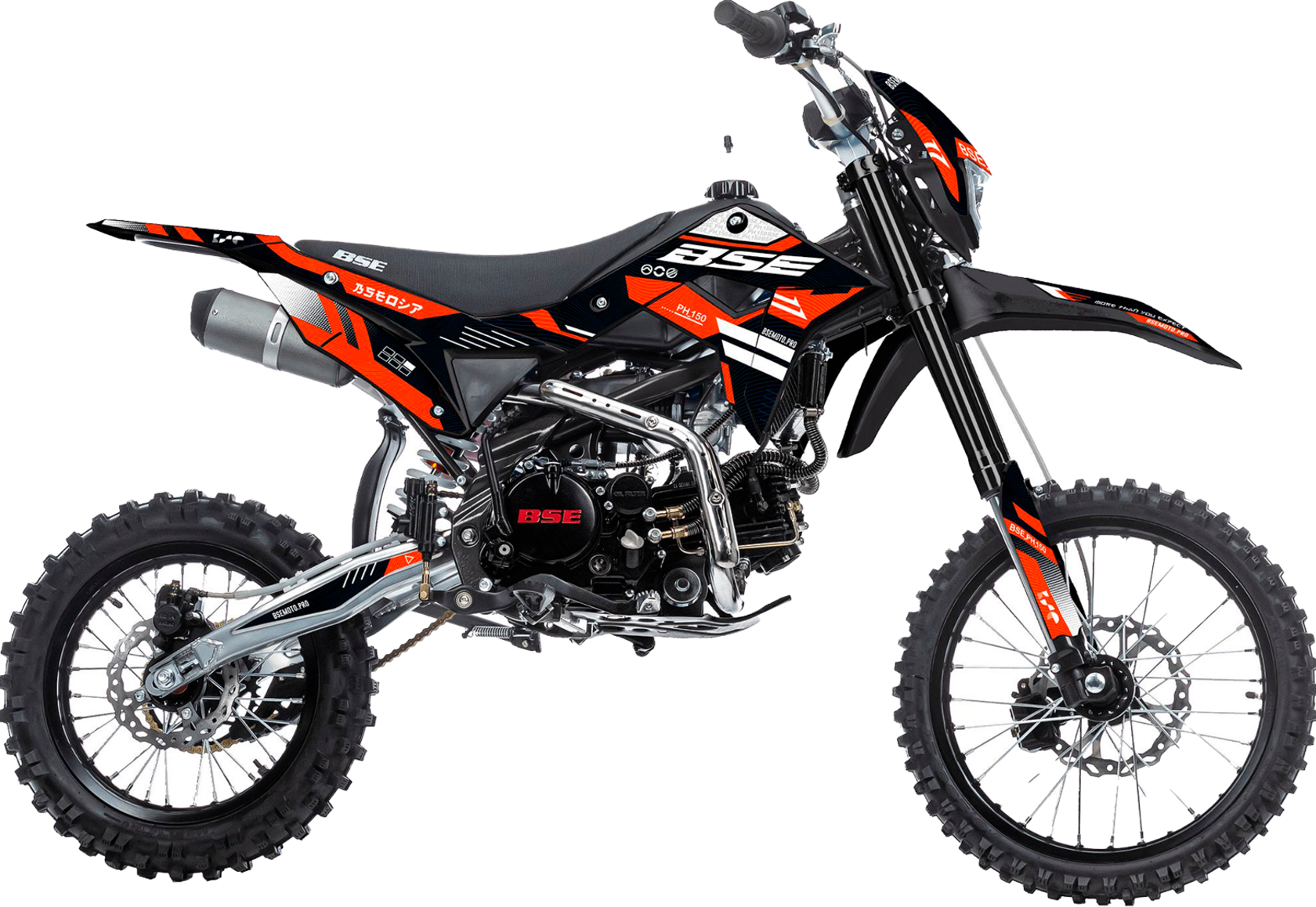 Питбайк BSE PH 150 19/16 AK47 Red (015). Основа PH150 - рама из хромомолибденовой стали повышенной жесткости с литыми усилителями - фирменный знак качества завода BOSUER! Cиловая установка питбайка - надежный и тяговитый 4-тактным двигателем YX объёмом 150 см3 с воздушным охлаждением. Максимальная мощность – внушительные 15 лс. Питает мотор карбюратор MIKUNI VM22. Питбайк оснащен 4-ступенчатой механической трансмиссией. Запуск мотора осуществляется при помощи электростартера или кик-стартера. Подвески с большими ходами: передняя - телескопическая вилка перевёрнуто типа, задняя- моноамортизатор. LED фара головного света, "злая" резина, vощная тормозная система HSK Racing, японские колесные подшипники NTN, защита мотора, руль ProTaper - питбайк полностью укомплектован всем необходимым для покатушек и гонок.PH150 – профессиональный выбор самого продвинутого "питбайкера".