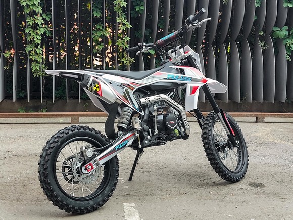 Питбайк Full Crew FC125e отлично подходит для пробующих мотоспорт – резвый мотор на 125 кубов с 9 лошадиными силами прекрасно работает с механической коробкой. Охлаждение воздушное – простая конструкция облегчает ремонт и удешевляет обслуживание. Для начинающих эта модель особенно интересна еще и из-за цены – можно основам научиться на нем с перспективой пересесть в дальнейшем на что-то более серьезное.Рама стальная усиленная, конструкция обеспечивает высокую удобную посадку, а подвеска (передняя перевернутая вилка и задний моноамортизатор) обеспечивает мягкое движение по кочкам, оврагам, деревьям и прочим всевозможным преградам на дикой трассе. Гидравлические тормоза работают надежно и четко.Из дополнительных приятных «плюшек»:- рычаги сцепления и тормоза откидываются;