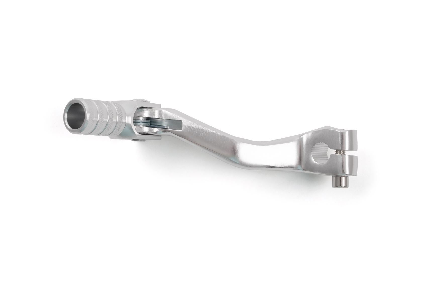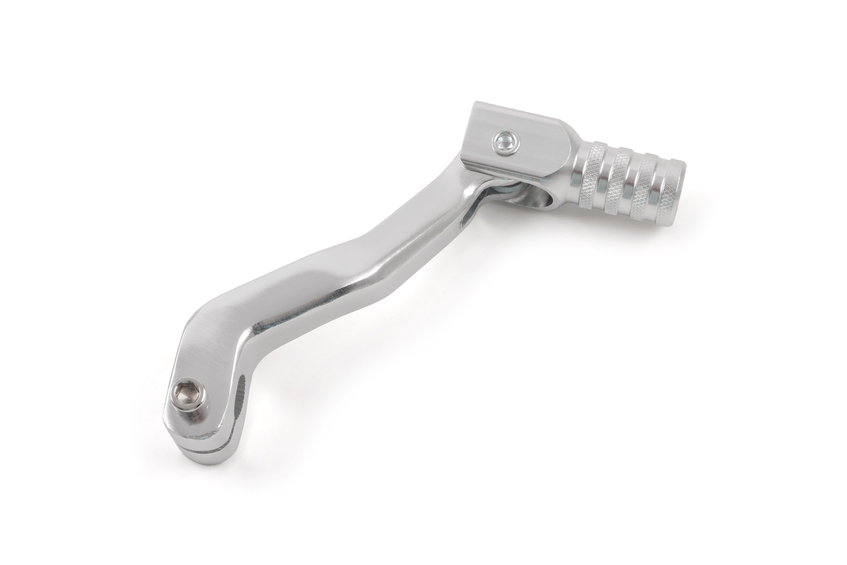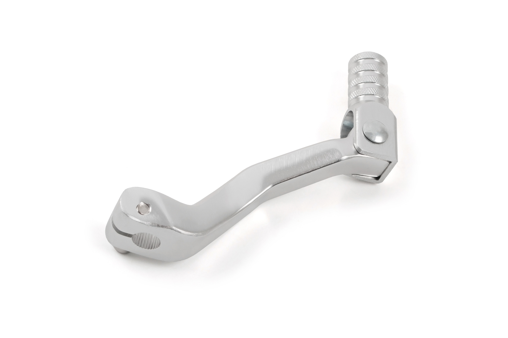Алюминиевый складной рычаг переключения передач серебристого цвета для эндуро мотоциклов с двигателями 165-172 FMM и 174 CBS-NB. Изготовлен из литого алюминия со складным кончиком, который предотвращает поломку рычага при падении или боковом ударе. Универсальная конструкция с вылетом, не гнет вал при падениях. Установка без втулки. Совместим с двигателями 165FMM, ZS170MM-2, ZS172-3A, ZS172-5A, ZS174MN-3.