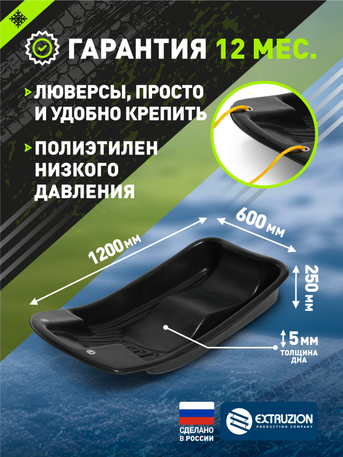 Санки ледянки для катания с горок (сани волокуши). На санях установлены люверсы, что облегчает крепление упряжки (буксировочной веревки). Сани произведены из ПНД (полиэтилен низкого давления) выдерживают перепады температуры -60С до +60С. Благодаря наличию светостабилизирующей добавки материал стоек к ультрофиалетовому излучени