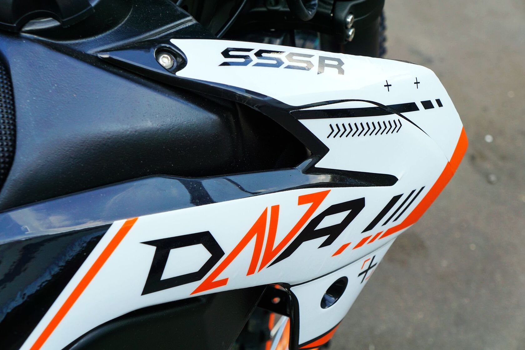 Кроссовый мотоцикл SSSR DNA построен на прочной стальной среднеразмерной раме. Высота по седлу – 900 мм. Как раз то, что нужно для комфортного и уверенного передвижения по сложным трассам райдерам разной комплекции. Подвеска – нерегулируемая SX, ее настроек вполне хватит для начально и среднего уровня подготовки. Как и тормозов - дисковой гидравлики HSK.