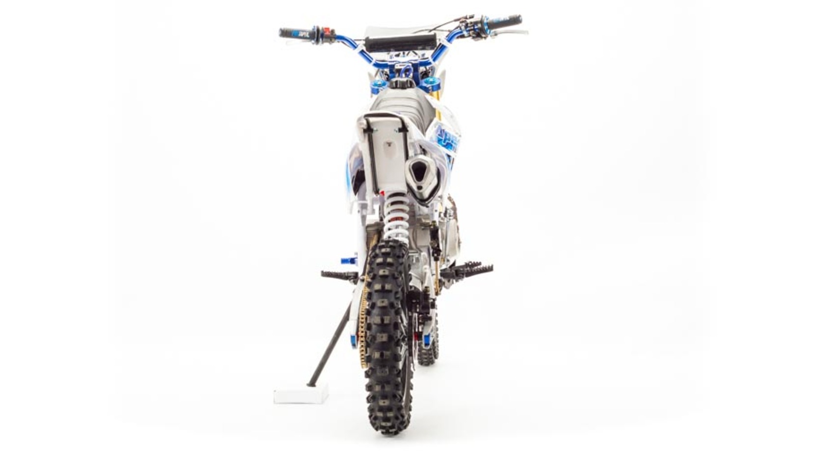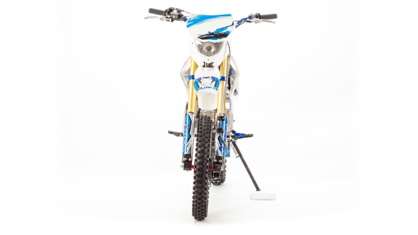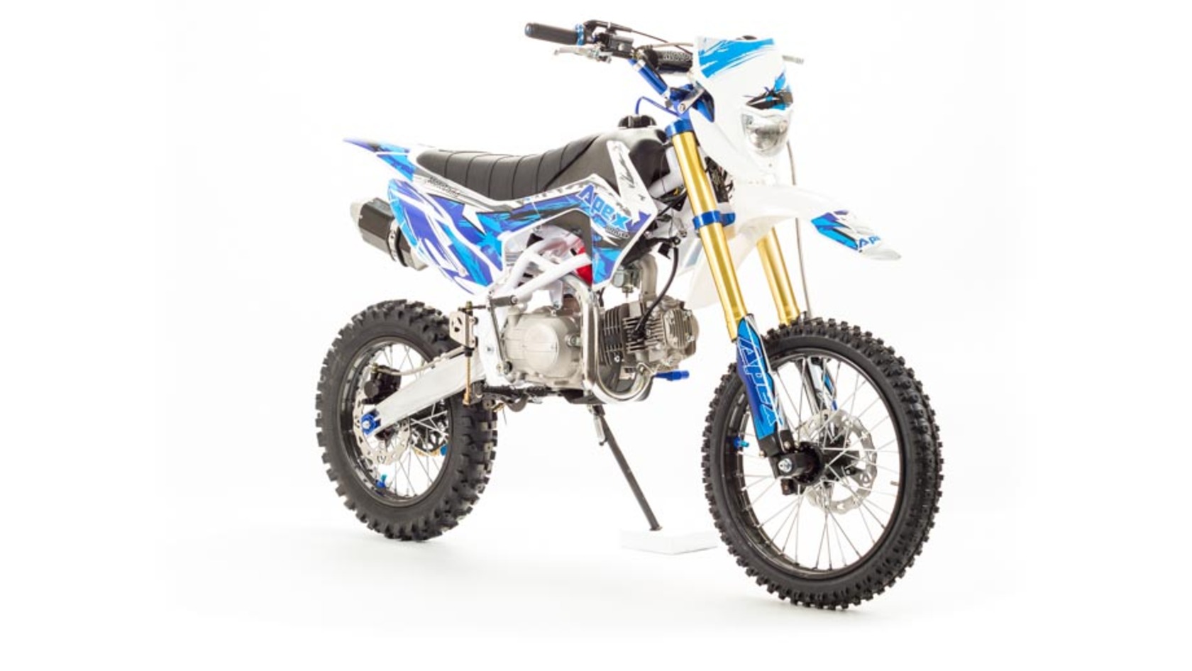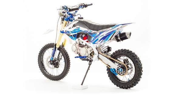 Недорогой надёжный питбайк APEX125 идеален для поездок по грунтовым дорогам и бездорожью. Хорошо чувствует себя на мягком и среднем грунте, разгоняется до 90 км/ч. Оснащён CNC траверсами, фарой, алюминиевыми ободами, весит всего 90 кг. Питбайк прост в управлении и не требует специального ухода, подойдёт как новичкам, так и любителям мотокросса.У кроссового мотоцикла APEX125 отличный узнаваемый дизайн. Конструкция подчёркивает неуступчивый спортивный характер питбайка, который не остановится ни перед одним препятствием. Пластик комбинированный, прочный, не ломается при сгибании. Кроссовый мотоцикл APEX125 доступен в красном и синем цвете, при этом в основной цвет окрашен не только пластик, но и обода колёс и другие детали питбайка.Передняя подвеска — телескопическая нерегулируемая вилка перевёрнутого типа, которая отлично подходит для преодоления ям, ухабов и других неровностей плохих дорог или их отсутствия. Задняя подвеска маятниковая с моноамортизатором. Руль 22 мм с высоким подъёмом и перекладиной удобен для мотоциклистов разного роста. Ручки руля — комфортные PRO TAPER. Питбайк оснащён складными рычагами сцепления и переднего тормоза, а также CNC-лапкой переключения передач.Питбайк весит всего 75 кг, при этом выдерживает вес до 150 кг. Оснащён CNC траверсами, рама полудуплексная стальная, мотоцепь качественная. Колёса спицованные, сделаны из прочного и лёгкого алюминия. Размер заднего колеса — 14 дюймов (350 мм), переднего — 17 дюйм (430 мм). Тормоза дисковые, передний тормозной суппорт двухпоршневой, задний — однопоршневой.Питбайк оснащён карбюратором с фильтром нулевого сопротивления VM22 MIKUNI и одноцилиндровым четырёхтактным двигателем с воздушным охлаждением. Надёжный мотор мощностью 9 л. с. и объемом 125 см³ разгоняет кроссовый мотоцикл APEX125 до 90 км/ч. Коробка передач механическая, четырёхступенчатая. Система зажигания электронная (CDI), для запуска двигателя можно использовать кикстартер.СверхпроходимостьПокрышки с шипами и высоким грунтозацепом идеальны для бездорожья. Мощность мотора и небольшой вес питбайка позволяют ему преодолевать значительные препятствия и непролазную грязь, хорошо заходить в подъёмы.Для поездок при низкой видимости и в ночное время суток питбайк оснащён фарой, которая включается при повороте замка зажигания (1 – выключить, 2 – включить, 3 – свет). Также в комплекте есть щиток для номера, который ставится вместо фары.Питбайк 125 относится к недорогим моделям, которые при должной эксплуатации работают без сбоев и капризов. Кросс неприхотлив в обслуживании, не занимает много места в гараже. При необходимости в нём легко сменить любую повреждённую деталь. Купить питбайк 125 вы можете в официальном магазине Мотолэнд, здесь же всегда можно приобрести запасные детали и комплектующие, которые стоят недорого и всегда есть в продаже. При покупке питбайка не забудьте о защитной экипировке.