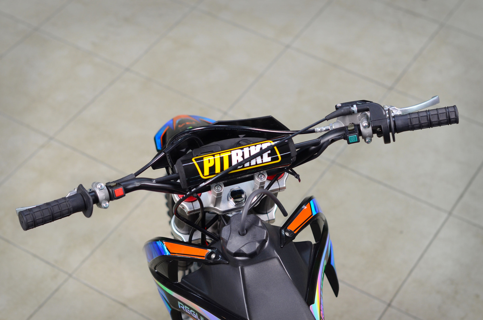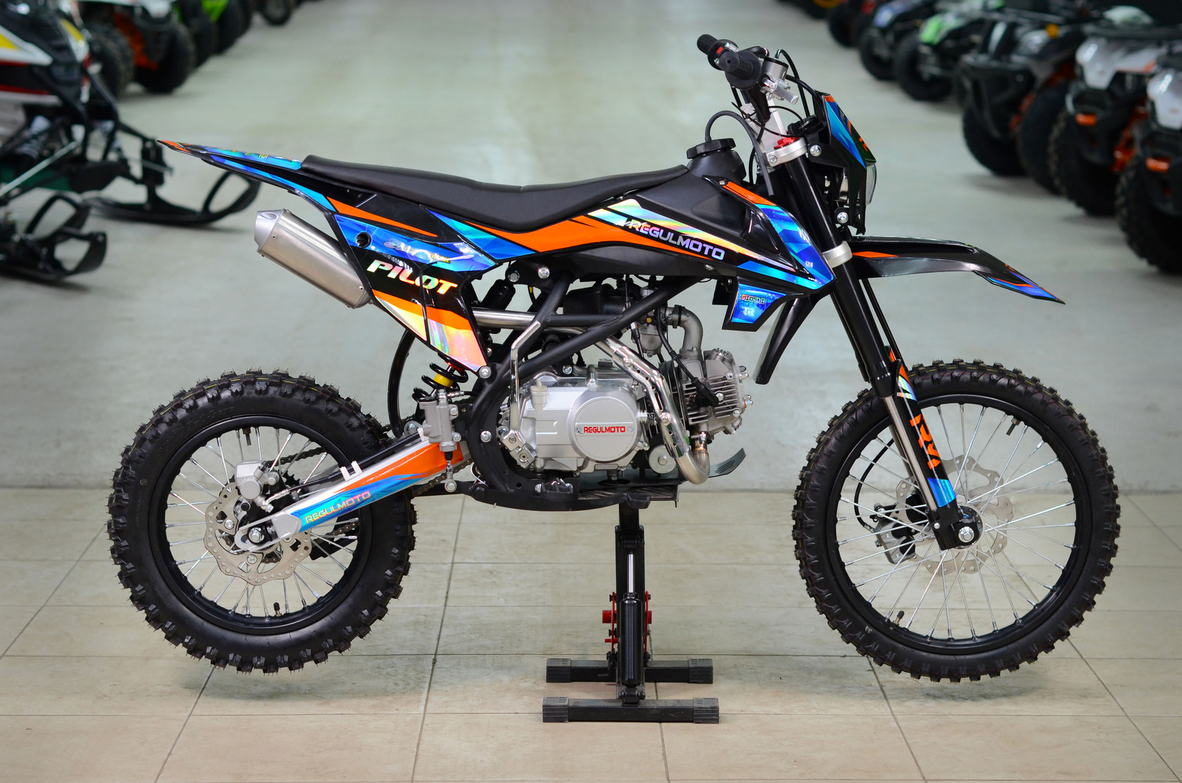 Regulmoto Pilot c электростартером и классической механической коробкой передач– питбайк начального уровня, созданный специалистами Американского мотобренда PitsterPro для юных мотогонщиков.Данная модель представляет линейку мототехники Regulmoto модельного ряда 2023 года, отличается высокой надежностью и простотой в эксплуатации.В прочной и надежной раме питбайка стоит 4х-тактный двигатель YX воздушного охлаждения с 4-ступенчатой классической механической трансмиссией.Высокий класс используемых комплектующих обеспечивают необходимый для внедорожной мототехники уровень надёжности и комфорта.Яркая светодиодная фара позволяет использовать питбайк также в тёмное время суток.В 2023 году Regulmoto Pilot получил ряд обновлений – кроме нового дизайна графики, изменения коснулись дизайна пластикового обвеса, подножек, рычагов тормоза, переключения передач и глушителя.Эта модель рассчитана на детей и подростков возрастом от 7 до 15 лет.Наличие классической механической трансмиссии позволяет детям и подросткам с минимальным опытом управления двухколесной мототехникой быстро освоить основы и совершенствовать навыки вождения на бездорожье.